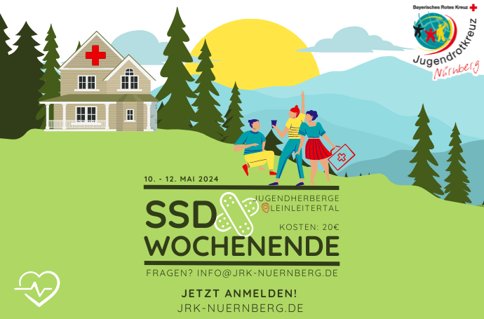 Zum SSD-Wochenende vom Jugendrotkreuz sind alle Schulsanitäter*innen aus Nürnberg geladen. Wir brechen am 10.05. gemeinsam Richtung Heiligenstadt auf und besetzen das Jugendhaus Leinleitertal. Bis zum 12.05. haben wir dann eine Menge lustiger Aktionen für euch geplant, die eure Teamfähigkeit unter Beweis stellen. Euch erwartet jede Menge Spaß, Abwechslung und die ein oder andere Überraschung.